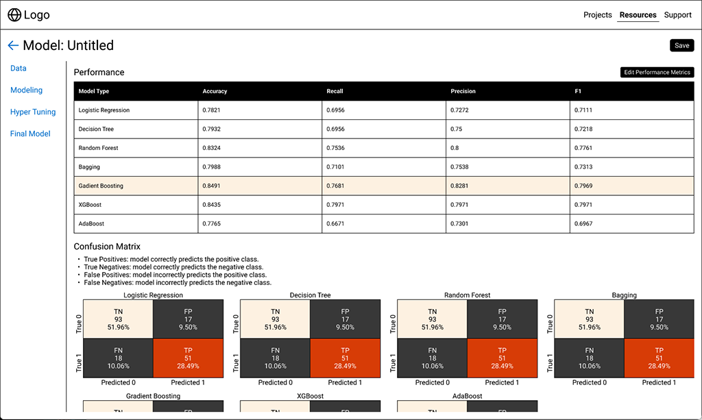 This is a wireframe concept of a Data Science Portal. The user will be able to import / analyze data, build models, and create pipelines. All those parts can then be used and reused in multiple projects.